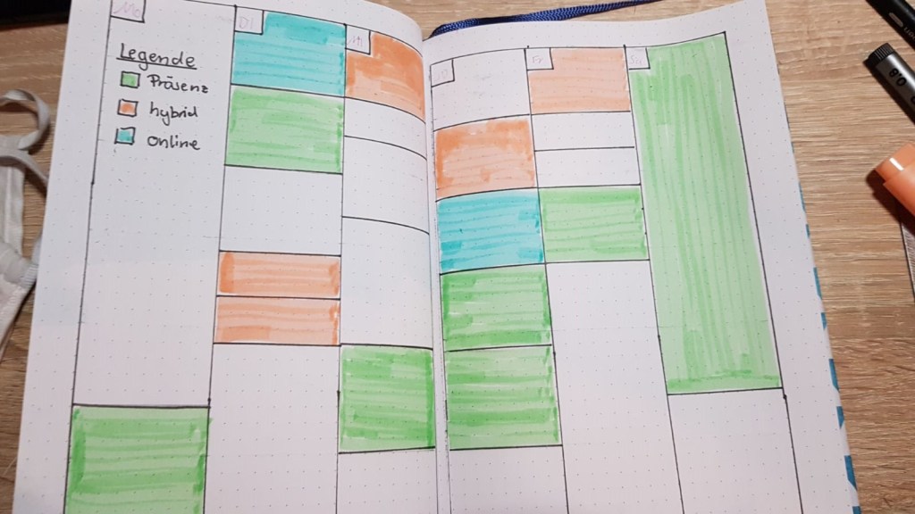 Ich versuche viele verschiedene Farben zu nutzen, um schnell einem Überblick zu bekommen, was ich gerade habe und wie wichtig diese eine Veranstaltung für mich ist. Ich werde in der nächsten Zeit einen Plan zum Lernen für die Klausuren am Ende des Semesters erstellen. Es klingt zum jetzigen Zeitpunkt wie ein Streberlernplan, aber ich habe die Schule vor drei Jahren verlassen und manche Dinge hab ich dadurch wieder vergessen und muss sie nun wieder lernen und das kostet Zeit. Aber mit einem Plan sollte ich das alles in drei Monaten wieder drauf haben und das Semester schaffen. 🙂